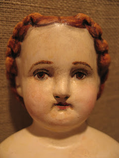 She had been repainted before. I purchased her on Ruby Lane with Christmas gift money with the intention of repainting her again. She wasn't bad, but I thought she looked a bit hardened. I wanted a softer look. I know she's not painted in the colors which would have been original but I really like reddish brown hair and brown eyes.